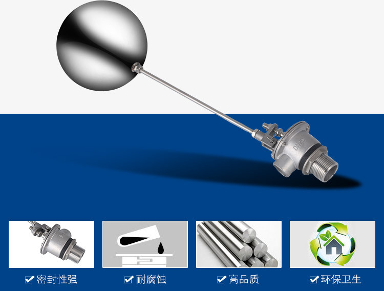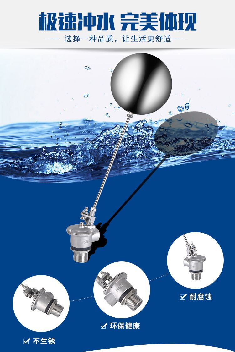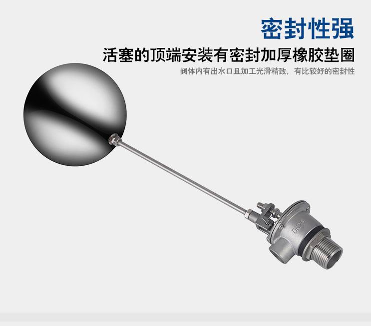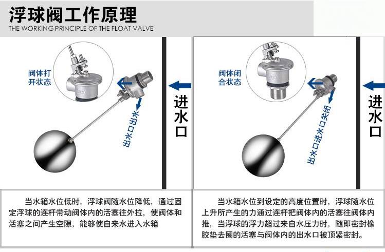 當水塔內水面下降時,浮球下落,利用水管內水的壓力,將閥體里的密封硅膠柱塞打開,閥體開啟供水,當水塔水位上升時,浮球上浮,連桿帶動柱塞,硅膠體密封進水孔,閥體停止供水.