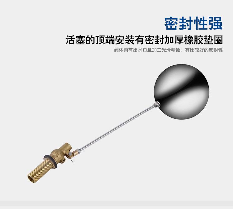 當水塔內水面下降時,浮球下落,利用水管內水的壓力,將閥體里的密封硅膠柱塞打開,閥體開啟供水,當水塔水位上升時,浮球上浮,連桿帶動柱塞,硅膠體密封進水孔,閥體停止供水.