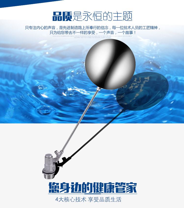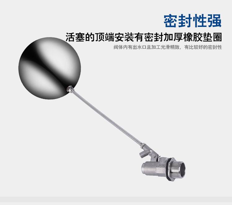 當(dāng)水塔內(nèi)水面下降時,浮球下落,利用水管內(nèi)水的壓力,將閥體里的密封硅膠柱塞打開,閥體開啟供水,當(dāng)水塔水位上升時,浮球上浮,連桿帶動柱塞,硅膠體密封進水孔,閥體停止供水.